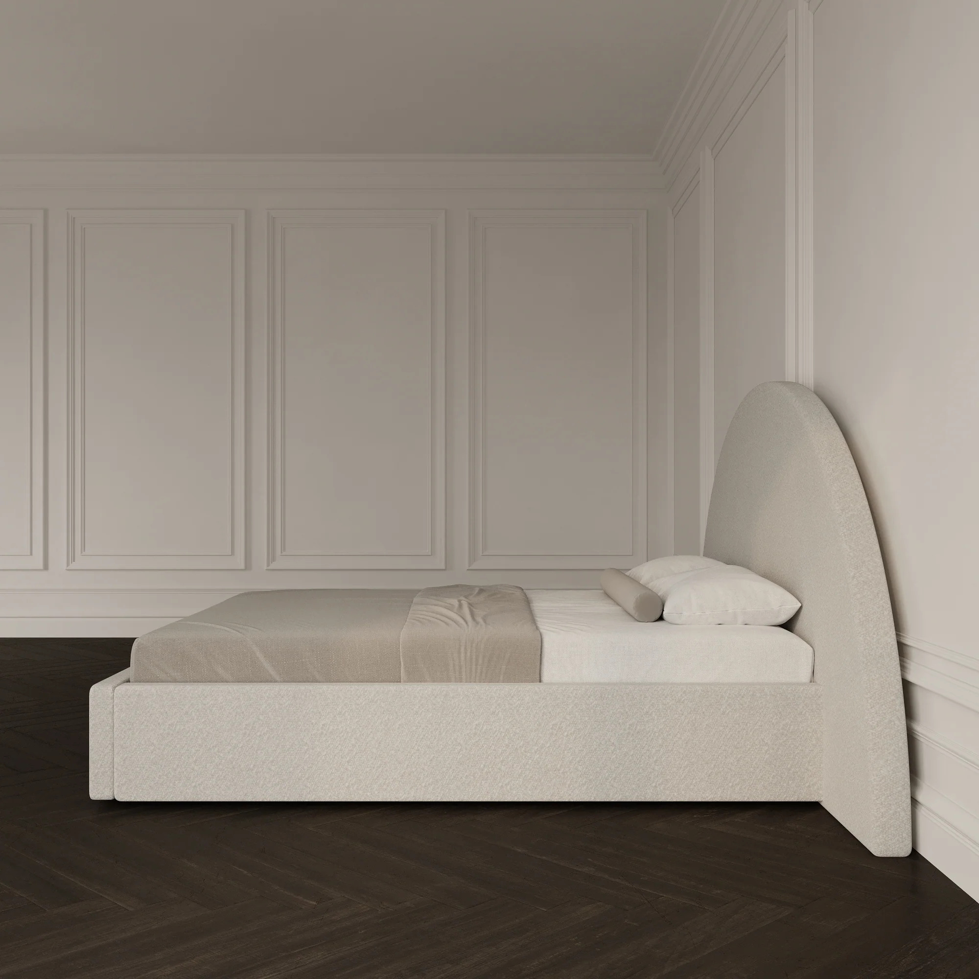 The soft, ethereal minimalism and misty tones of the Moon emanate an elegant purity, fostering peaceful sleep and operating in tranquil balance with the bespoke curvature of the headboard.